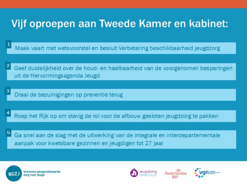 De Branches Gespecialiseerde Zorg voor Jeugd (BGZJ) roepen de Tweede Kamer op om vaart te maken met de nodige inhoudelijke verbeteringen van het jeugdstelsel, op basis van een duidelijke visie en gezamenlijke aanpak van de problemen van kinderen, jongeren en gezinnen. In aanloop naar het Wetgevingsoverleg Jeugd van 11 november brengen de gezamenlijke jeugdbranches vijf concrete punten onder de aandacht van de Tweede Kamer. De brief die zij stuurden is hier te lezen.